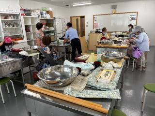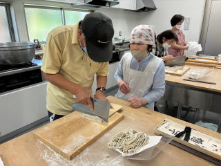 8月21日(木)東市民交流センターに於いて講師を招いてそば打ち体験を実施しました。参加者は、そば打ち道具の関係で14人までした。午前10時に集まり1回転目全員で指導を受けながらにそば打ち入りました。最初は何も分からないまま一生懸命腕を動かしてそば粉を捏ね、伸ばしそして切りに入り繊細に切る段階で時間かかりました。そして、2回目人が変わって同じように行いましたが何しろ初めての人ばかり時間ばかりかかってしまい予定時間12時までに、自分の打ち立てのそばを湯がいて昼食にする時間取れませんでしたので、自宅での試食になりました。